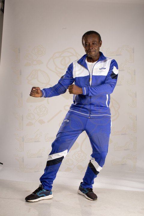 Homme mature ensemble sport bleu blanc tennis noire posture art martiaux