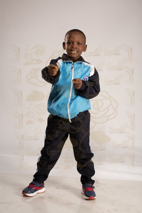 Jeune petit garçon africain tenue sport expression visage dent grand saut