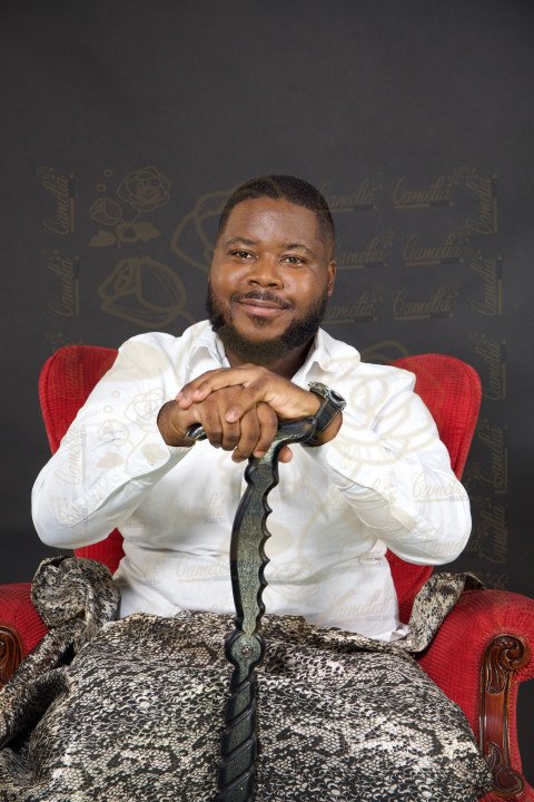 Africain assis fauteuil rouge uniforme traditionnelle canne main