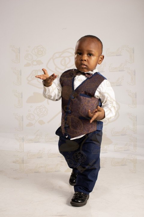 Petit enfant africain élégant jacket chemise blanche pantalon bleu paire noire mouvement