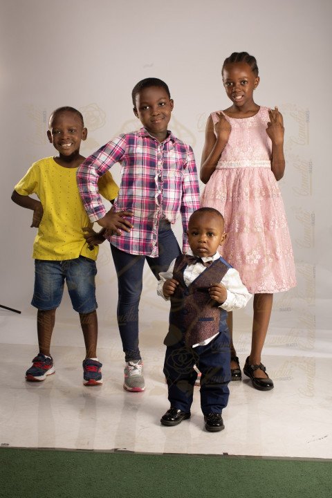 Famille jeune bébé enfant garçon fille t-shirt jaune chemise carrelé robe rose jacket