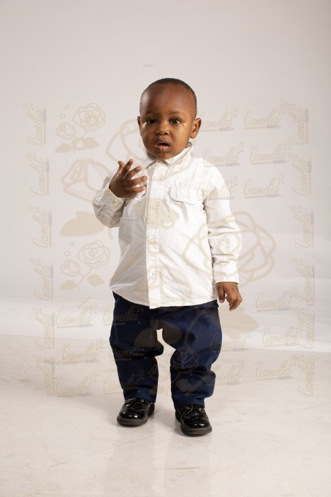 Petit garçon bébé africain mignon élégant chemise blanche pantalon bleu paire noire