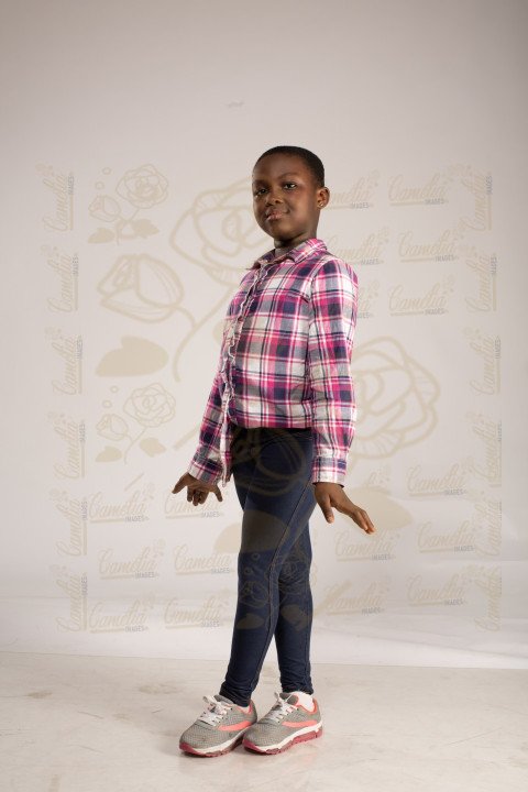Vu profil Jeune petite fille teint chocolat chemise carrelé pantalon jeans tennis grise