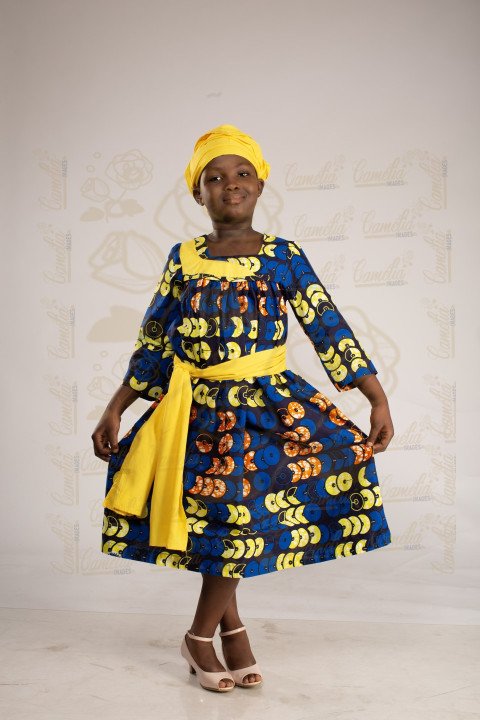 Jeune petite fille africaine foulard jaune cabas ceinture talon rose pieds croisés