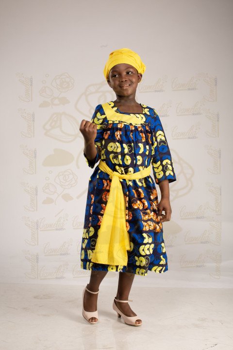 Jeune petite fille africaine foulard jaune cabas ceinture talon rose expression victoire