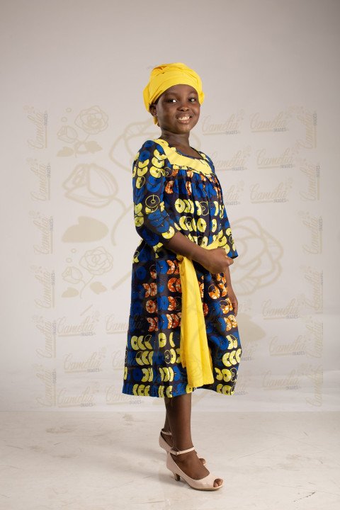 Jeune petite fille africaine foulard jaune cabas ceinture talon rose jolie sourire