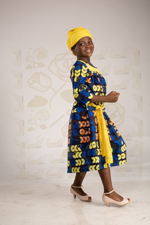 Jeune petite fille africaine foulard jaune cabas ceinture talon rose mouvement gestuel