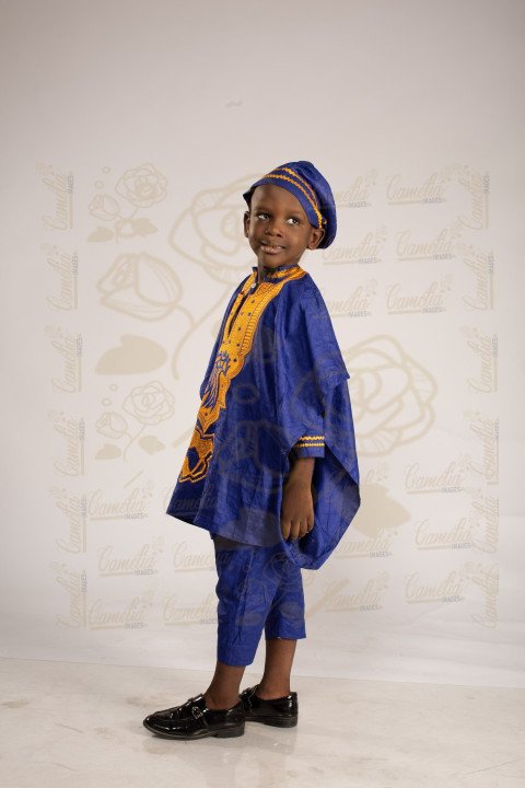Jeune petit garçon uniforme Gand bleu tenue traditionnelle paire noire design or