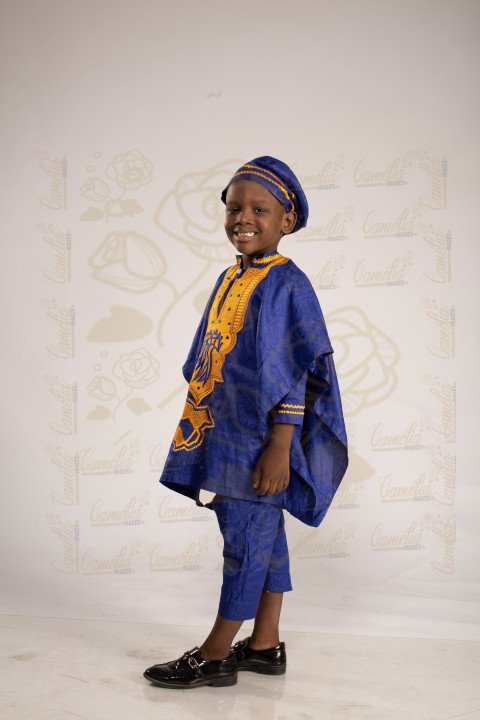 Papa africain ensemble veste bleu ciel paire noire ceinture grimasses sourire mouvement pieds