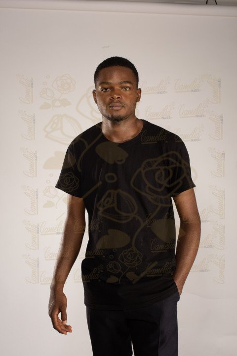 Portrait Jeune homme africain t-shirt noir pantalon noire chaussure noire main poche