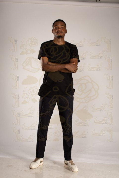 Jeune homme africain t-shirt noir pantalon noire chaussure blanche bras croisés