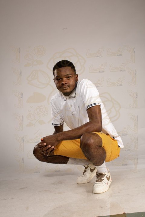 Jeune homme africain accroupie polo blanc culotte jaune tennis