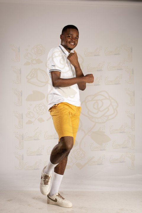 Bel homme africain polo blanc culotte jaune chaussettes tennis blanches