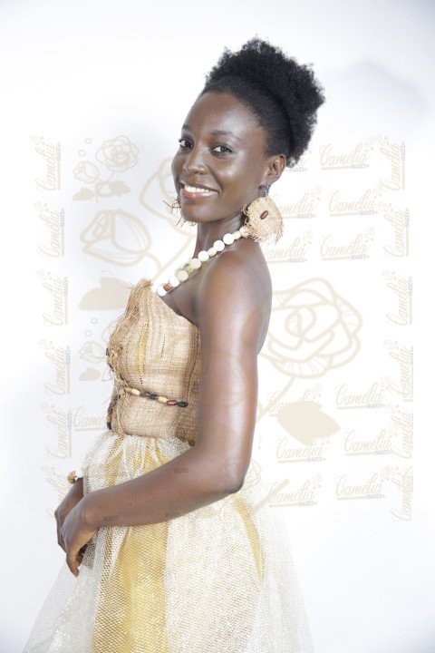 Jeune femme noire élégante ,souriante,avec une robe de soirée glamour,une couronne de noël,des cadeaux et décorations de Noël à ses côtés.