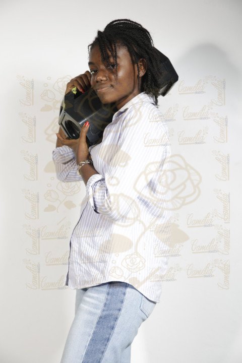 Jeune femme noire souriante,allure imposante, fixant l'objectif, vêtue d'une chemise blanche et d'une jupe grise claire, cheveux afro.