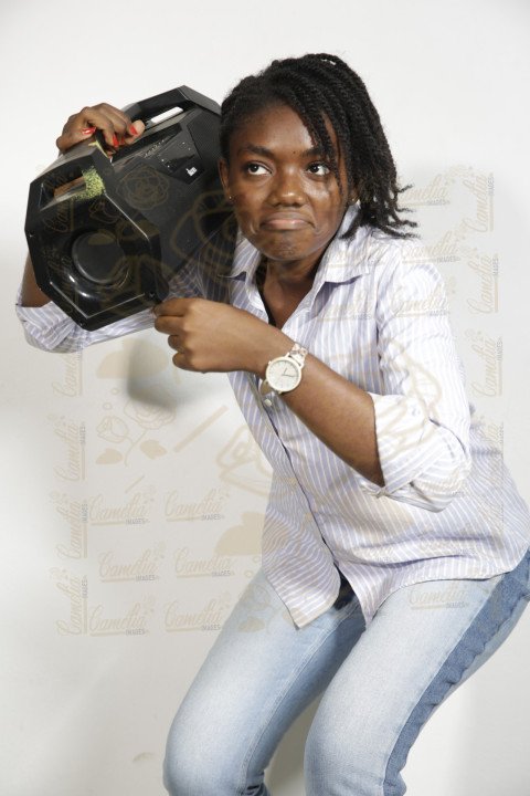 Une femme noire souriante, de profil, vêtue d'une chemise blanche et d'une jupe grise claire, sur fond noir.