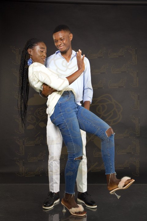 Jeune homme africain teint claire tient femme teint chocolat boucle oreille pantalon destroy