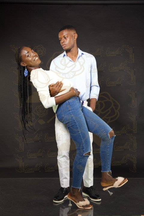 Jeune homme africain teint claire tient femme teint chocolat boucle oreille pantalon destroy