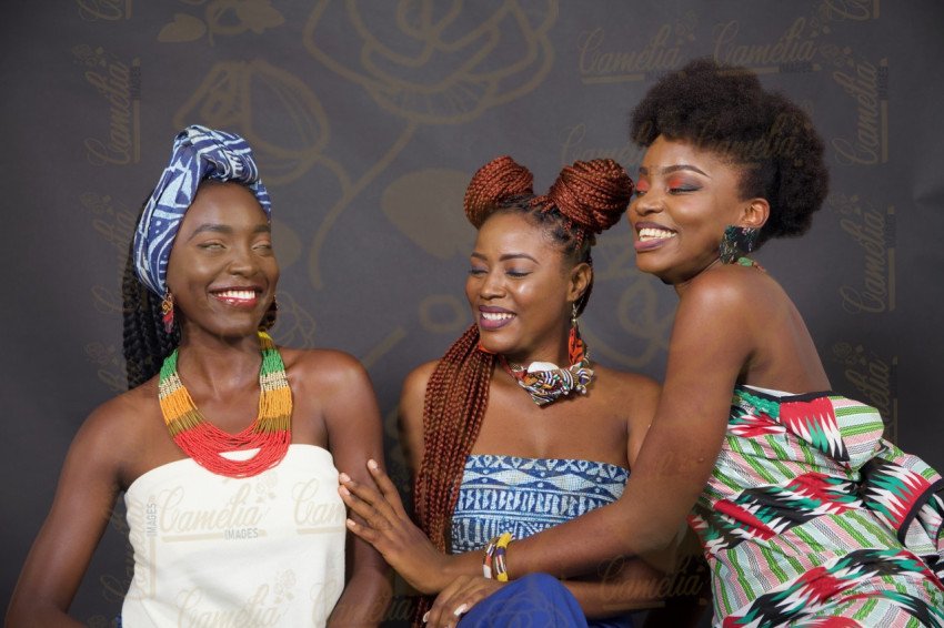 Trois femmes africaine yeux fermés coiffure rasta afro foulard maquillage jolie sourire