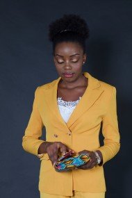 Femme affaire africaine veste jaune coiffure afro sac a main pagne