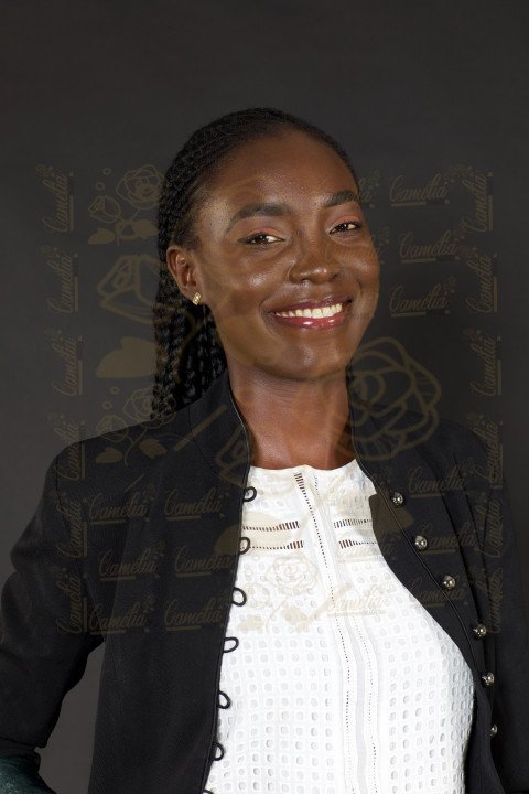 Grand sourire femme belle teint chocolat robe jaune noire gestuel cheveux afro