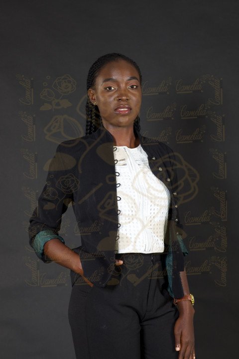 Jeune femme africaine veste noire t-shirt blanc jolie sourire main dans la poches