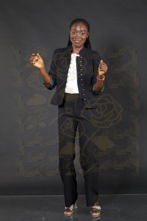Femme affaire africaine veste noire posture mannequin gestuel expression visage