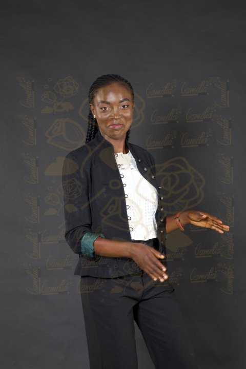 Femme affaire africaine veste noire gestuel expression visage grimasse bouche