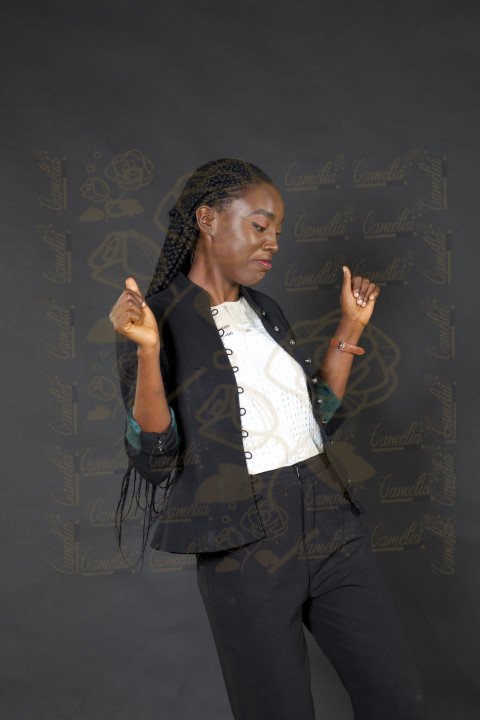 Femme affaire africaine veste noire gestuel expression visage gestuel danse