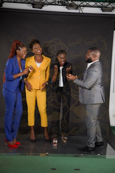 Trois femmes africaine souriante coiffure rasta afro veste jaune noire et grise