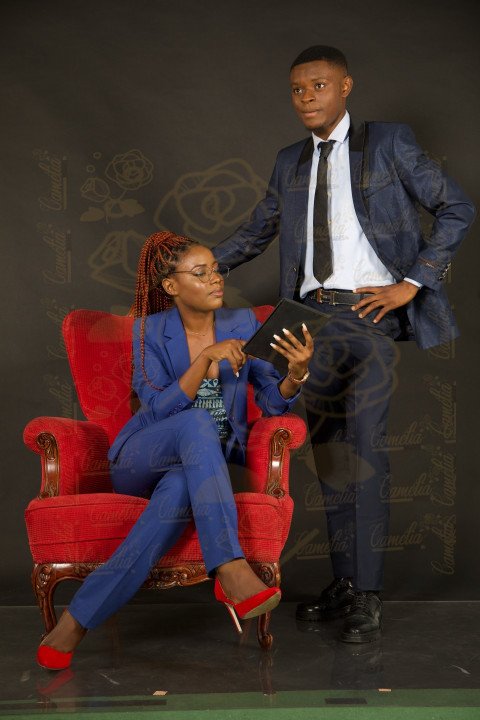 Jeune homme africain en costume violet cravate et femme en veste bleu talon rouge