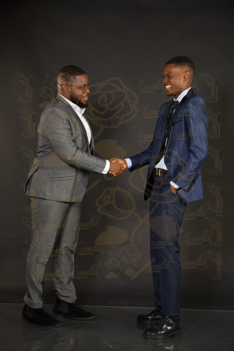 Hommes Africain salutation joie costumes gris violet cravate paire noire
