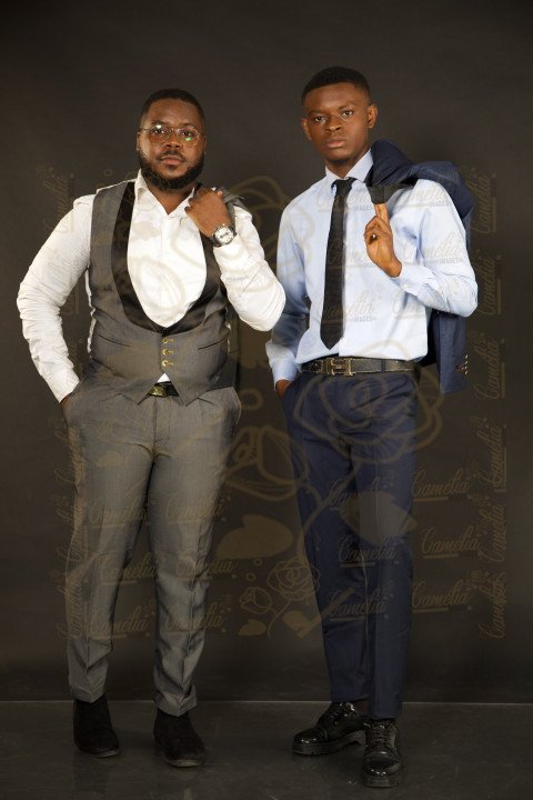 Deux hommes Africain en costumes trois pieces couleurs grise et violet