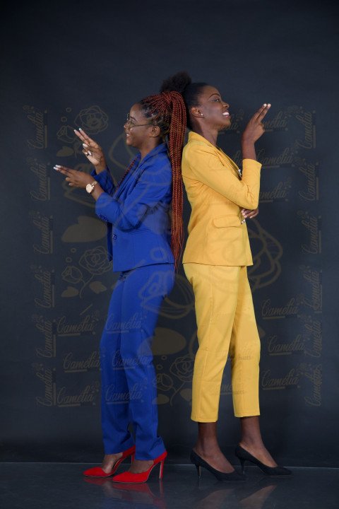 Deux femmes africaines ensemble veste jaune et bleu de dos jolie sourire talon