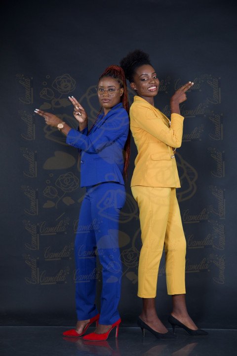 Deux femmes africaines ensemble veste jaune et bleu de dos jolie sourire talon