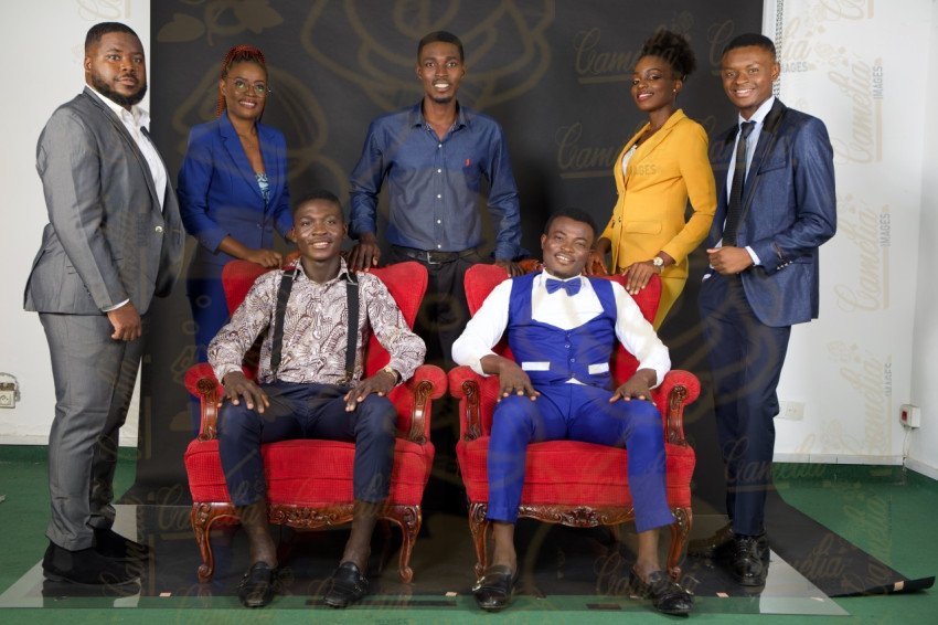 Groupes Hommes et femmes africaines costumes grand sourire assis fauteuil rouges