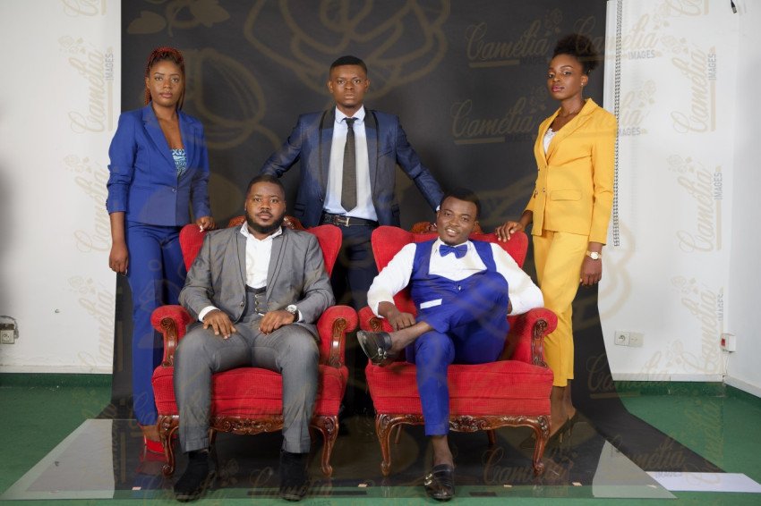 Groupes Hommes et femmes africaines costumes grand sourire assis fauteuil
