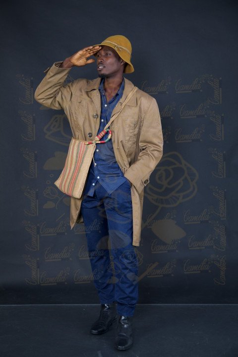 Homme paysan chapeau large bord veste marron sac traditionnel dent blanche