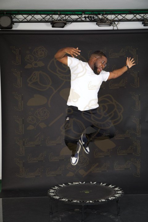 Un jeune-homme africain en noir , faisant des acrobaties , style décontracté et sportif