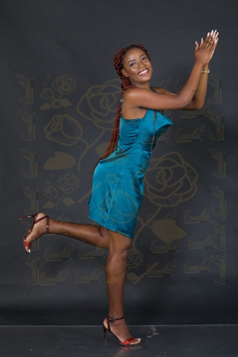 Top model africain teint chocolat robe fleurit coiffure rasta talon transparente