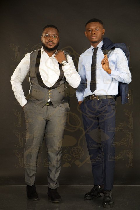 Deux Hommes Affaire Jeune teint claire costumes 3 pièces cravate paires et ceintures noires
