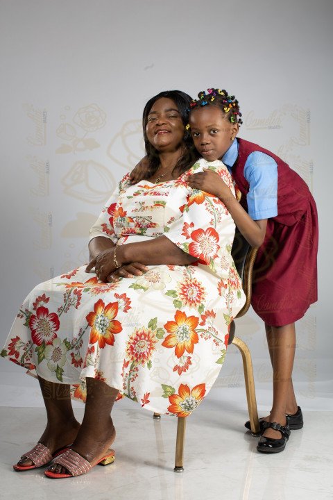 Maman africaine assise robre fleuri avec sa petite fille petit calin avent l'ecole