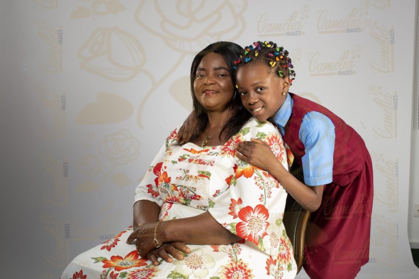 Maman africaine assise robre fleuri avec sa petite fille petit calin avent l'ecole