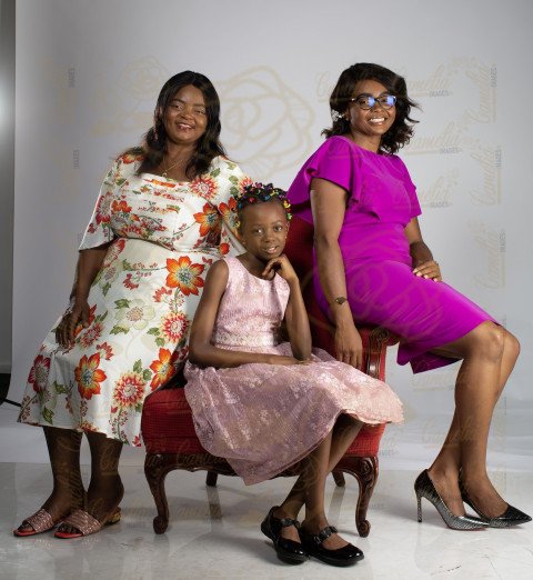 Famille Africaine maman fille sourire costume bleu paire noire robe fleur