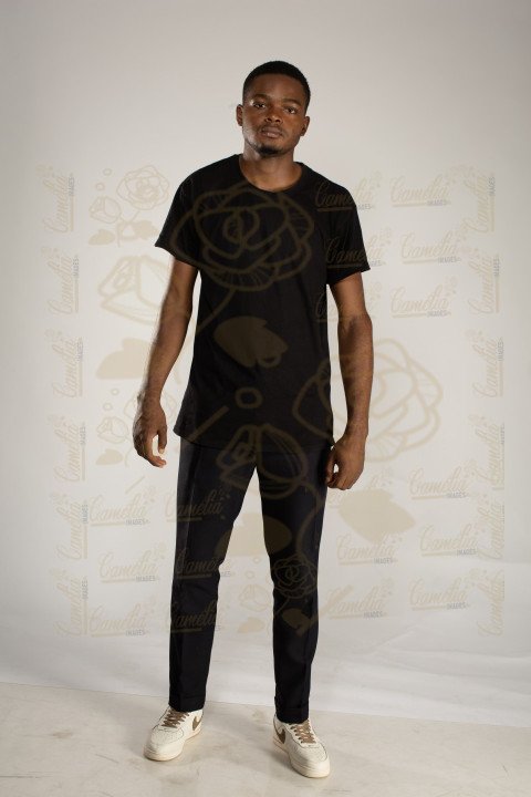 Jeune homme Africain t-shirt noir pantalon noir visage dur