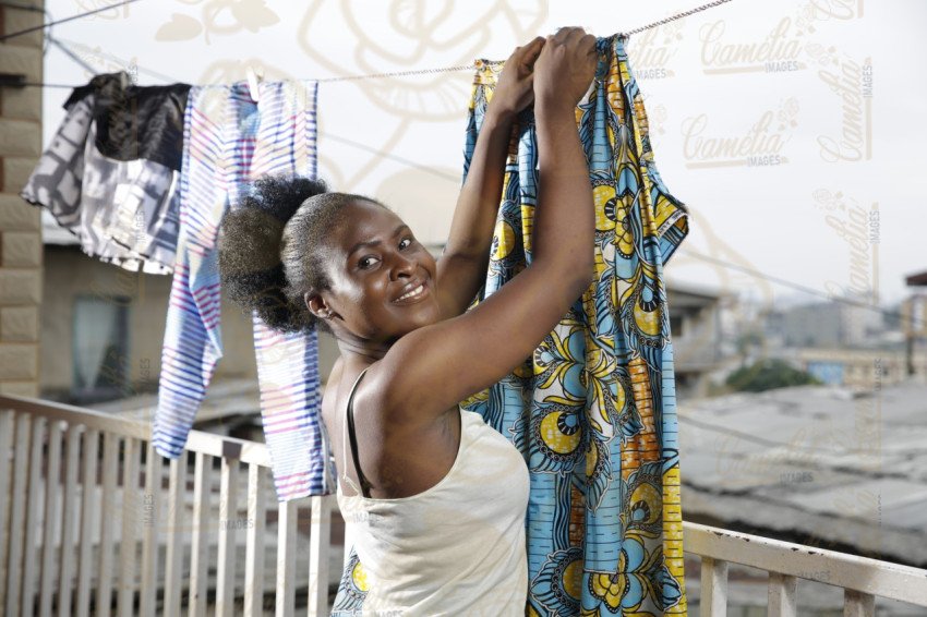 Jeune Fille Africaine Noir lessive domicile lieux exterieur cheveux vent