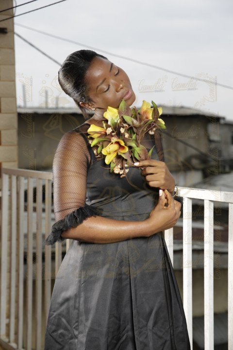 Femme africaine yeux fermés fleurs sur la potrine reve penseés