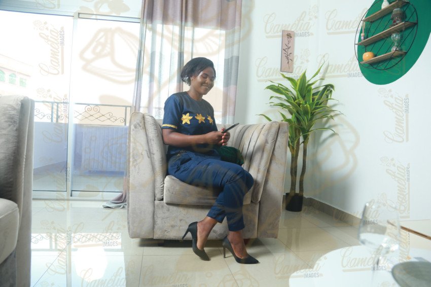 femme africaine teint caramel ensemble Bleu Nuit etoile jaunne