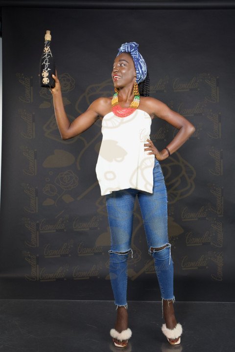 Femme au teint chocolat foulard afritude coliers bouteille design noir pantalon jeans