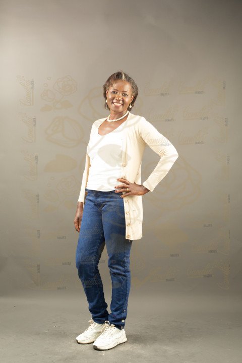 Une femme noire adulte debout, avec un style décontracté